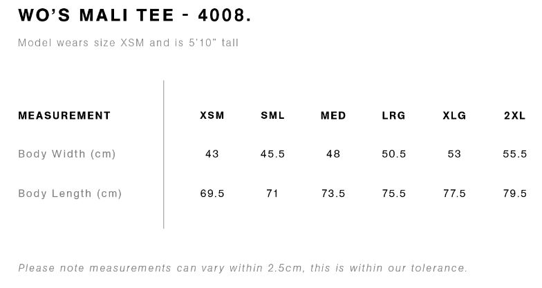 Regular fit Scoop neck, capped sleeves, curved tails Light weight, 150 GSM, 34-singles 100% combed cotton (marles 15% viscose) Self-fabric binding on neck, side seamed, double needle hems, preshrunk to minimise shrinkage 2XL only available in Black, Grey Marle, Navy and White